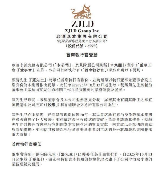 10月13日,珍酒李渡集团(6979.HK)发布高管任命公告:汤向阳任集团首席执行官,颜涛任集团执行董事兼董事会副主席,两项任命即日生效。