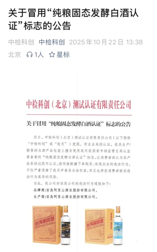 10月22日,中检科创(北京)测试认证有限责任公司官方发出“关于冒用‘纯粮固态发酵白酒认证’标志的公告”。