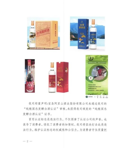 中检科创(北京)测试认证有限责任公司郑重声明:宝岛阿里山酒业股份有限公司未通过我司的 “纯粮固态发酵白酒认证”审核,未获得我司颁发的“纯粮固态 发酵白酒认证”证书。将对其进行公告,向有关监管部门举报其侵权行为,并保留通过法律途径追究其责任的权利。同时,我司也提醒广大企业和消费者注意防范类似情况的发生。
