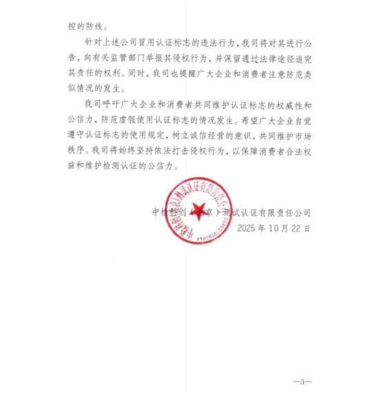 中检科创(北京)测试认证有限责任公司直接点明这家违法侵权单位: