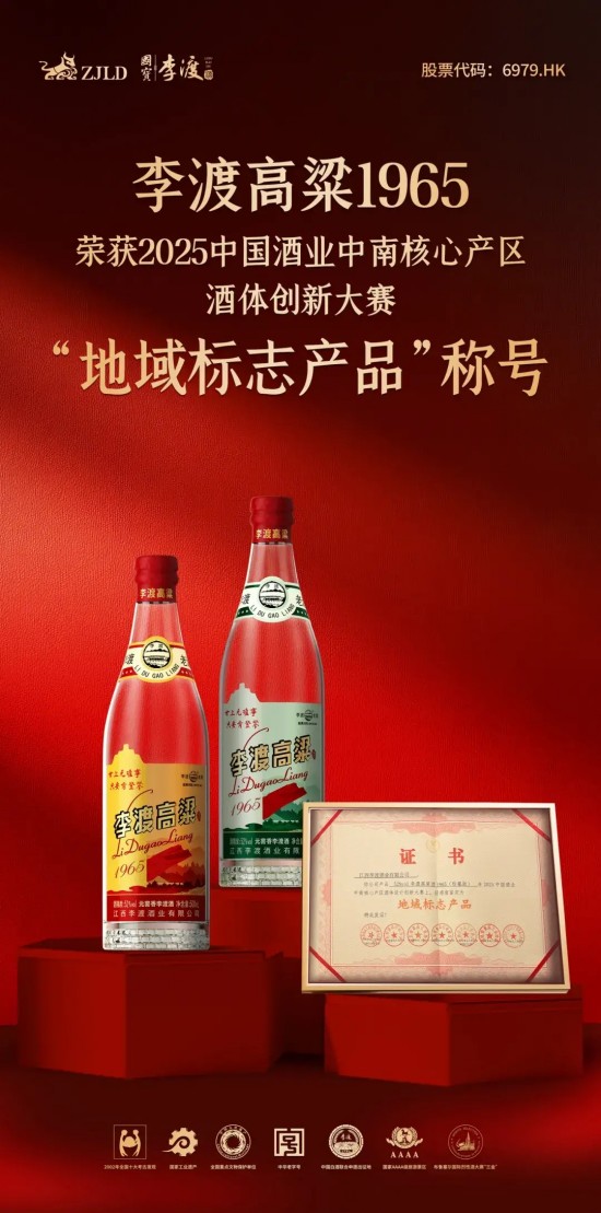 11月26日,第六届中国酒业中南核心产区大会暨酒体设计创新大赛在广东召开,“2025中国酒业中南核心产区酒体设计创新大赛鉴评会”中,“李渡高粱1965”凭借卓越的酒体设计与风味表现,荣获最高荣誉,被评为“地域标志产品”称号,充分彰显了其在白酒品质与技术创新的领先实力。专家参与评审与产品荣获头奖,双重印证李渡在酿造工艺与酒体设计上已达到行业顶尖水平。