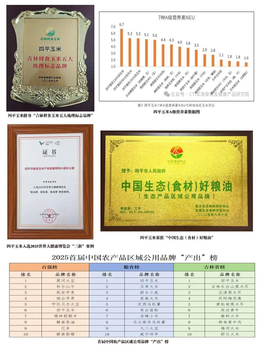 立足黄金玉米带天赋异禀,四平玉米以品牌建设撬动价值升级。2025年,荣登世界大健康博览会“三新”案例榜单,斩获“中国生态(食材)好粮油”“生态产品区域公用品牌”,获评首届中国农产品区域公用品牌“产出”百强榜总分第六名、粮食榜“产出”总分第一名、吉林省榜“产出”总分第一名等重磅荣誉,跻身“吉林鲜食玉米五大地理标志品牌”,“吉谷良时、一沐一草”入选“吉林鲜食玉米十大黄金名片”。华测检测权威认证:容重、蛋白质质量及A类营养素等核心指标领跑全国,让“四平玉米”的品质口碑掷地有声,铸就从地域瑰宝到国之名片的跃升传奇。