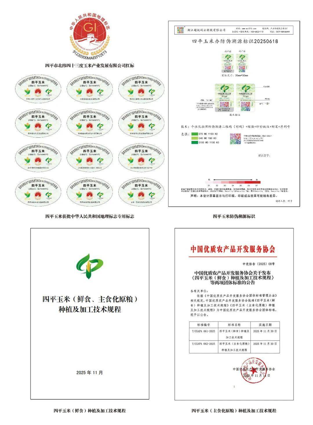 “四平玉米”成功获批国家地理标志产品,12家企业获专用标志授权,彰显国家级品质认可。联合中国优质农产品开发服务协会,制定四平玉米(鲜食、主食化原粮)种植及加工技术规程两项全国最高团体标准,核心指标均超国标及行业地方标准,构建起科学完备的双标体系。创新“区块链+溯源”监管模式,实现“一品一码”全流程管控,树立全国玉米主食化品质标杆,为优质优价提供权威技术支撑,引领行业标准化升级。
