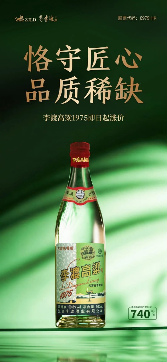 同日,李渡酒业发布调价通知:自2026年3月31日起,李渡高粱1975每瓶上调10元,调整后零售价为740元/瓶。