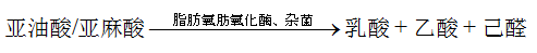 脂肪氧化酶催化不饱和脂肪酸的双键发生过氧化,生成氢过氧化物,氢过氧化物自发分解为脂肪酸、己醛、戊醛等;该反应为微量反应,生成的醛类物质含量极低(mg/kg级),但阈值低,是酱香酒粮香的基础。