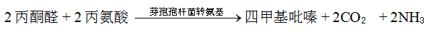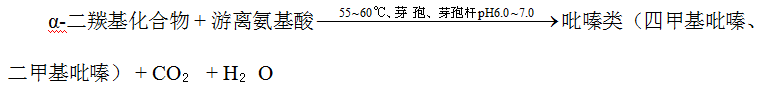 底物为美拉德反应生成的α-二羰基化合物与游离氨基酸,在芽孢杆菌代谢酶催化下合成,总反应式: